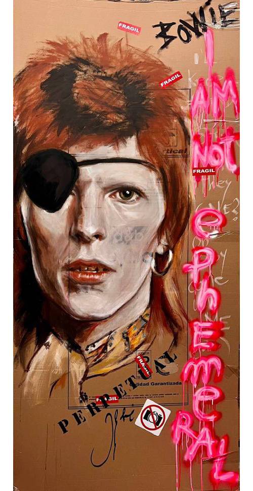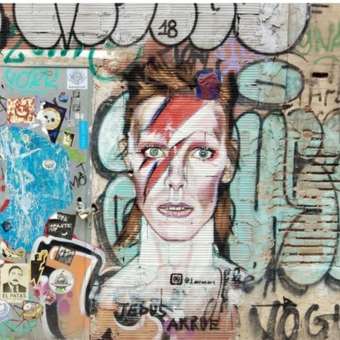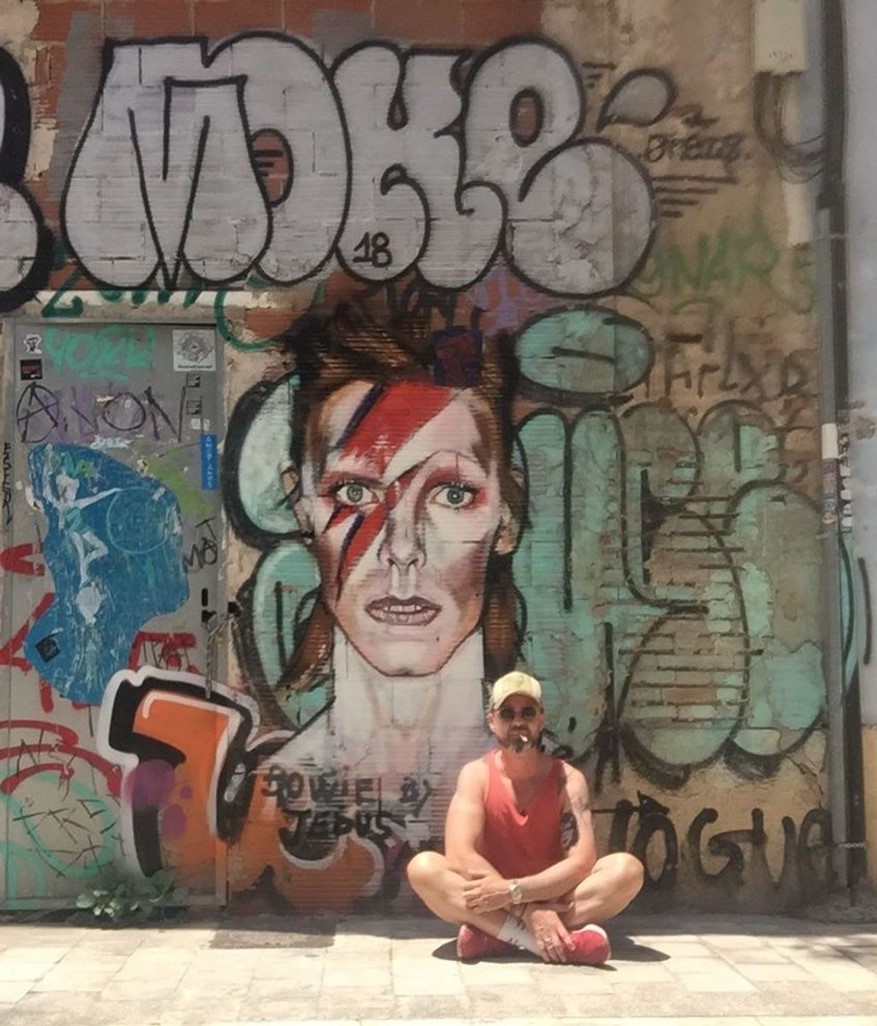 Aparte de Madonna Jesús hizo un gran grafiti del cantante David Bowie que también es una gran fan y detrás de esto hay otra historia. "Marilyn me contó que Madonna era una grandísima admiradora de Bowie y que había visto el grafiti que había hecho de él. Lo pinté en el barrio de el Carmen en memoria de la música de los años 80. Estaba realizado en un edificio que se iba a demoler de repente un político de Ciudadanos Fernando Giner se opuso a ello y lo llevó a una moción del ayuntamiento y junto con Gloria Tello deciden rescatarlo y pese a los 700 kilos que pesaba lo trasladaron al centro cultural de el Carmen y allí permaneció durante 2 años porque las exposiciones son itinerantes y se decidió trasladarlo al Museo Etnográfico de Valencia y lo acogieron como obra de interés cultural y le han dado una sala y ahí está. Ahora estoy desbordado de encargos y tengo pendiente el traslado de la feria de Mallorca y tengo que reconocer que mis precios se han disparado. No soy rico pero me puedo permitir vivir de mi pintura. Me encantaría poder hacer un retrato a la reina".