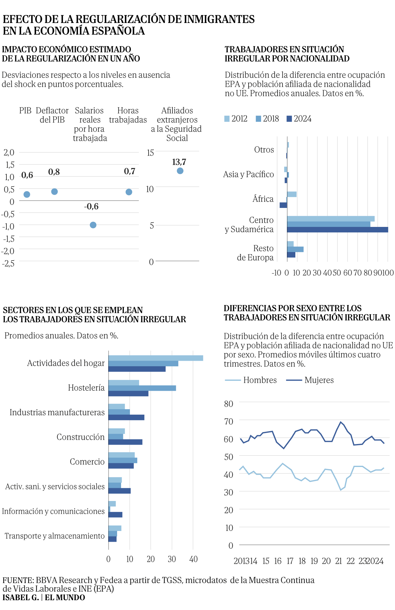 Por g?nero, hay m?s proporci?n de mujeres, y, por sector, se emplean principalmente en el empleo dom?stico, la hosteler?a, las industrias manufactureras, la construcci?n, el comercio, las actividades sanitarias y de servicios sociales, informaci?n y comunicaciones y transporte y almacenamiento.